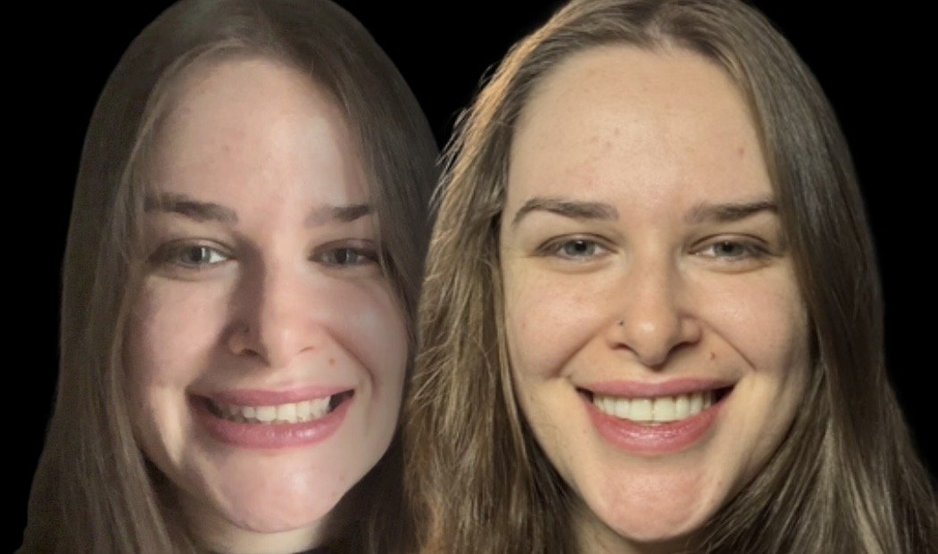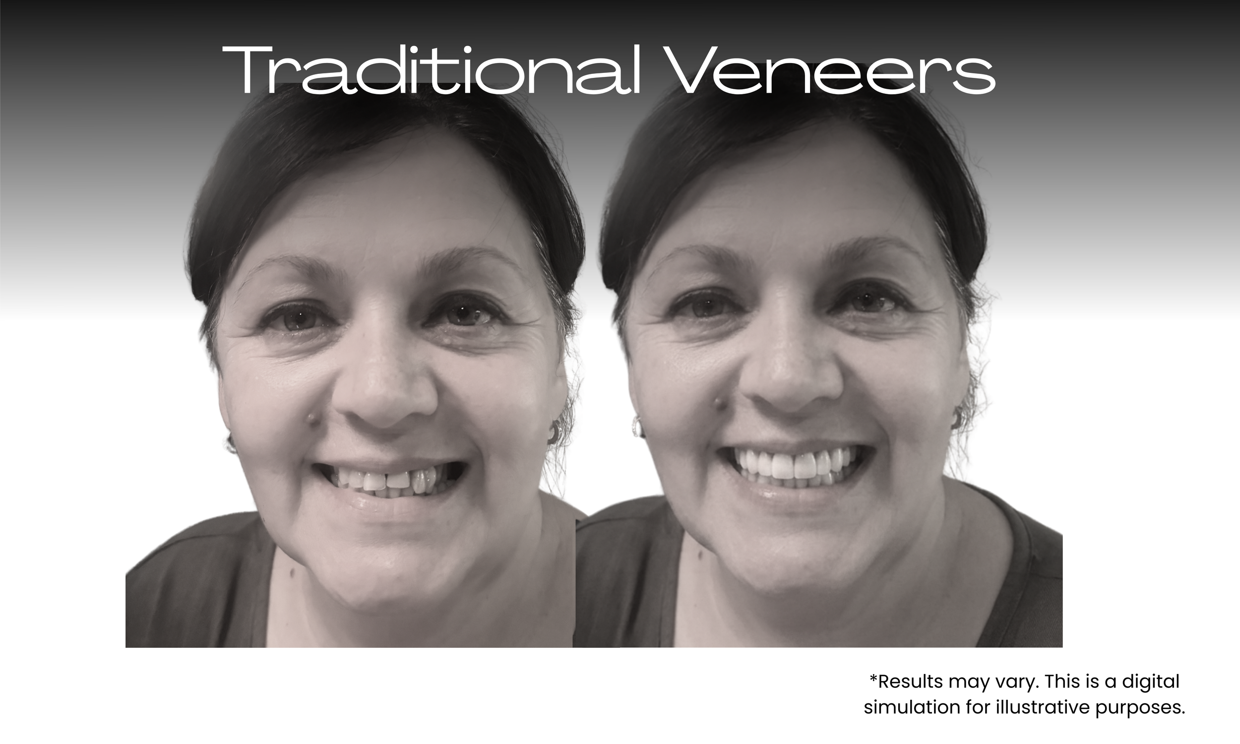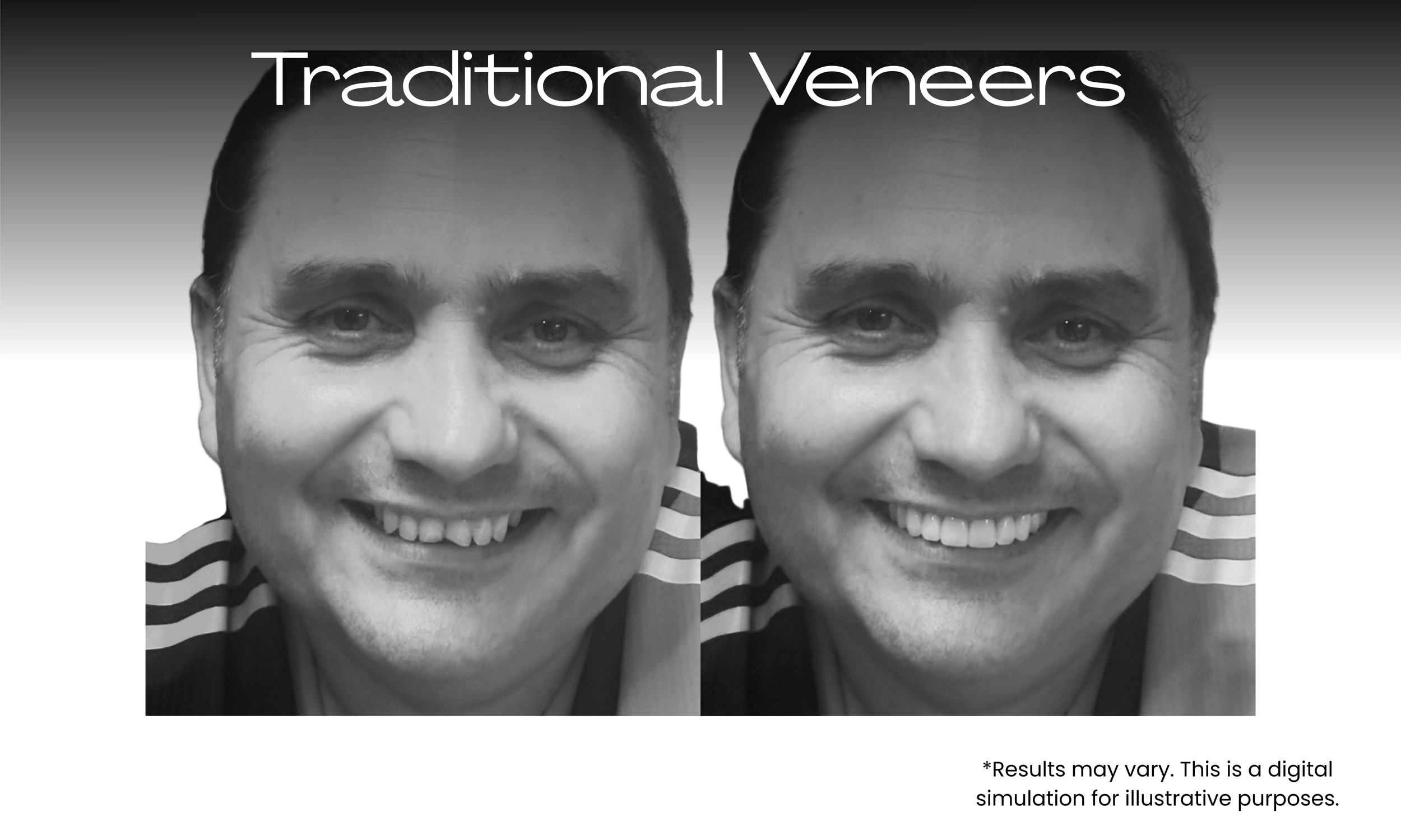 These are digital mock-ups of what these patients would look like after traditional veneers or composite bonding applied to an uncorrected bite. Their teeth are white and even but their smiles look forced and tense, or overly “toothy”.