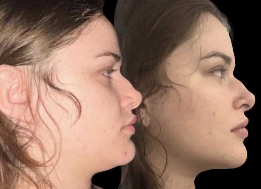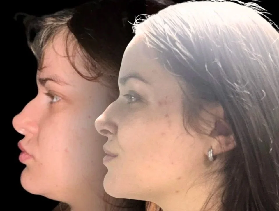 They have a retracted jaw position, meaning their mandible sits further back than its natural resting point, placing chronic tension on her temporomandibular joints. Over time, as happens naturally with age, their molar height has also decreased through normal wear. The molars are the structural foundation of the lower face. When they lose height, the vertical dimension collapses, the jaw rotates backward, and the surrounding musculature has to compensate constantly just to maintain position.